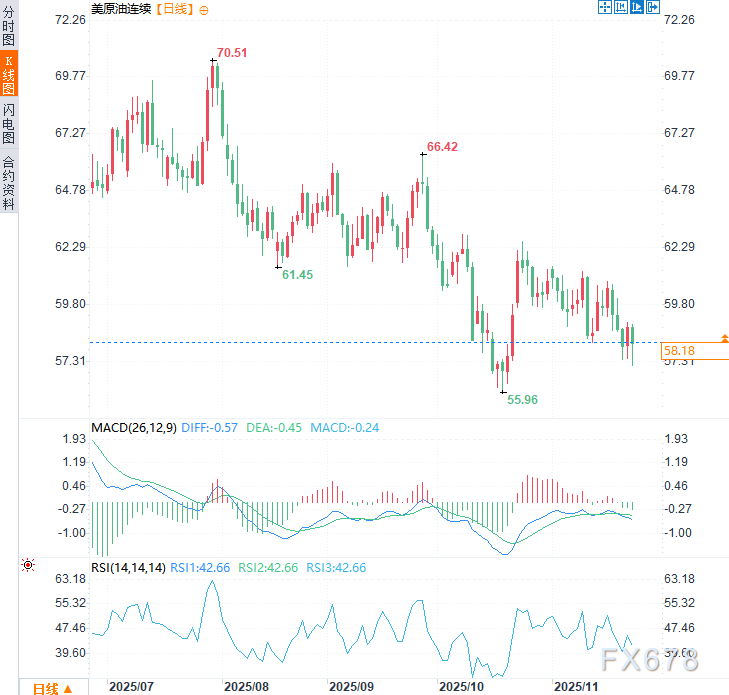 俄乌和平谈判出现的突破性进展,是当前原油市场一个不可忽视的看空信号。它正逐步抽离自冲突以来便根植于油市的风险溢价,周二美原油盘中一度下跌近3%创一个月新低至57.10美元/桶,收报58.11美元/桶,周三亚市美原油价格微涨0.40%,目前交投于58.20美元/桶附近。