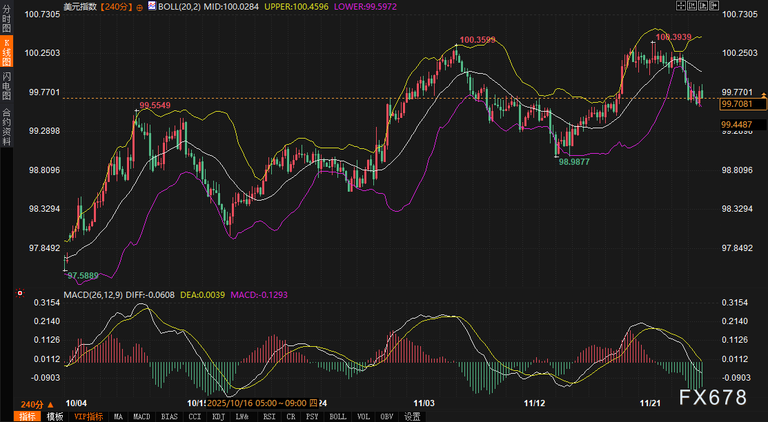 美元指数的疲软与美债收益率走势高度联动。4小时图显示,布林带中轨(100.0289)构成近期阻力,上轨(100.4586)与下轨(99.5991)界定波动范围。MACD的DIFF与DEA值分别为-0.0607和0.0039,处于零轴下方且DIFF下穿DEA,表明空头动能占优。美元若失守99.60支撑,可能进一步下探99.30-99.50区间。