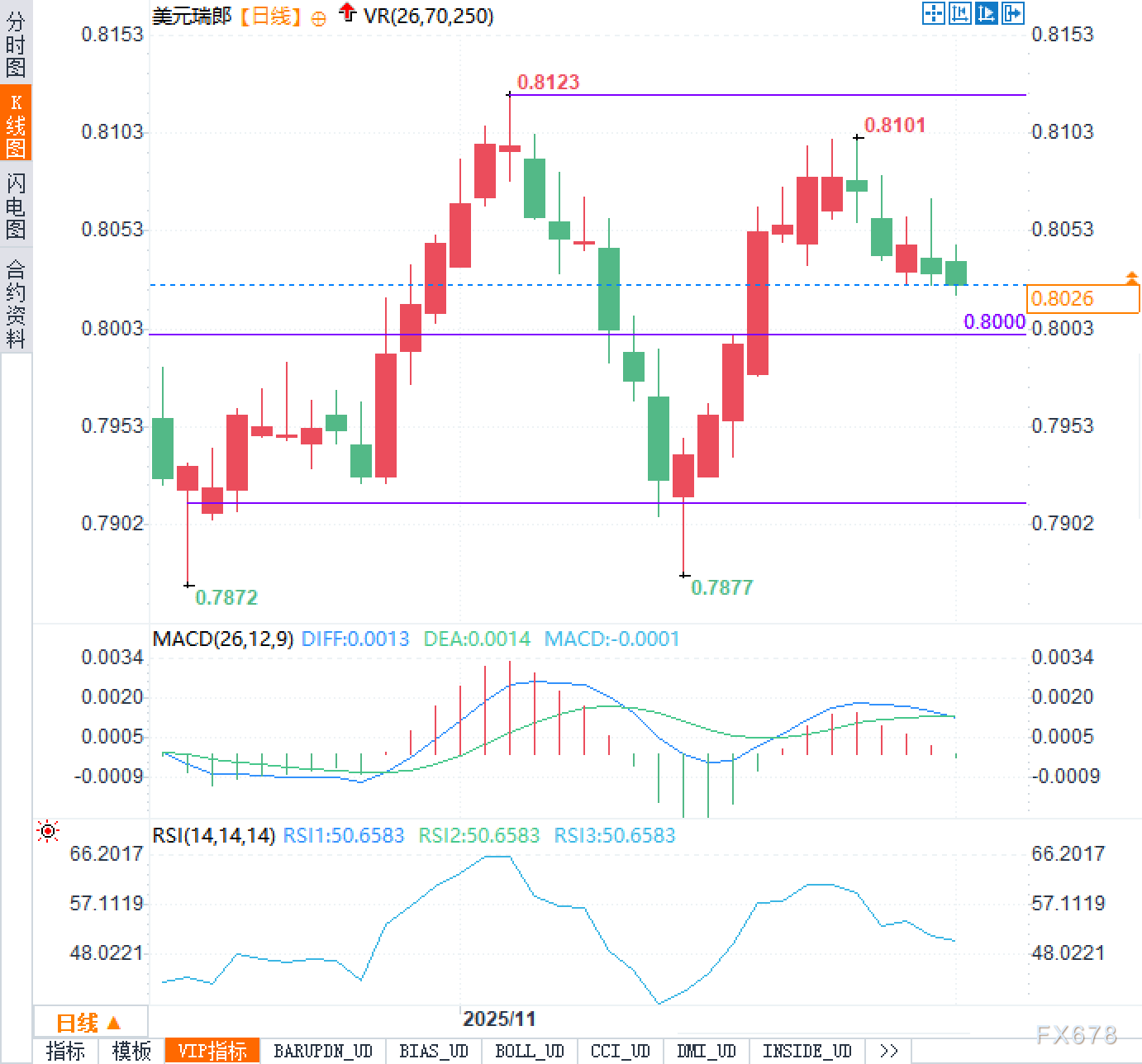 日线上看,美元兑瑞郎此前自0.7870一带构筑阶段低点后震荡走高,最高触及0.8123,形成较为明确的上方压力区,之后在0.8101附近再度受压回落,目前回调至0.8000上方反复整理,现价约0.8025,整体呈现自高位回落后的横盘消化结构。图中0.8000一线与前期密集成交区域重合,短期被视为多空力量的平衡带,若持续围绕该位窄幅波动,说明市场情绪偏中性、观望气氛较浓。