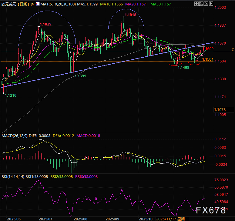 汇通财经APP讯——周二(12月2日)亚欧时段,欧元兑美元近期围绕高位展开震荡整理,此前周一在1.1650关键阻力区域遇阻回落,但仍坚守1.1600整数关口支撑目前交投于1.1607附近,凸显当前多空博弈下的区间震荡格局。