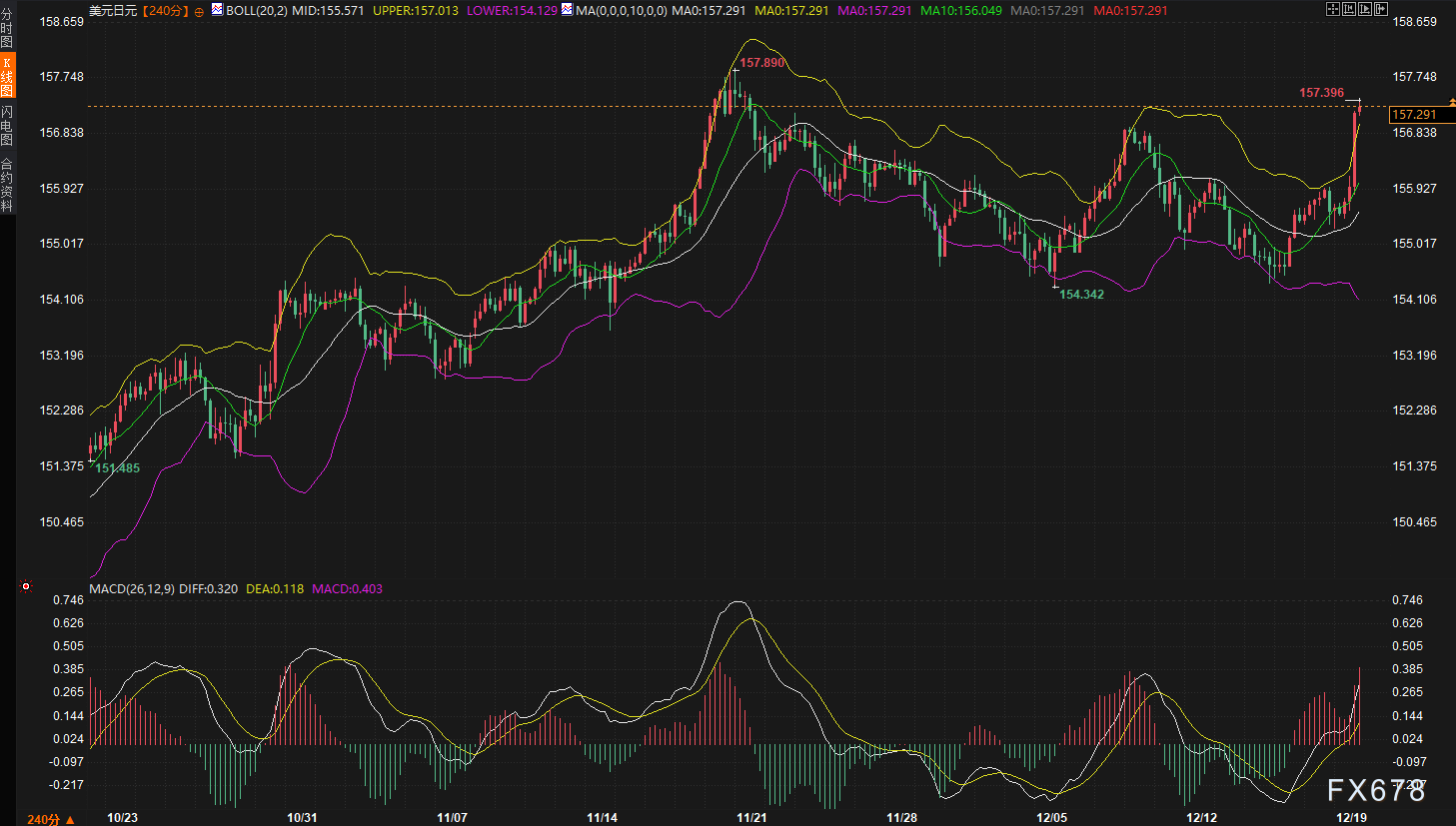 技术面上,美元兑日元的走势极具攻击性。240分钟图显示,汇价报157.299,日内大涨1.19%,强势突破布林带上轨157.016,远离中轨155.5725,呈现明显的超买突破形态。MACD指标中,DIFF线(0.321)大幅上穿DEA线(0.119)并远离零轴,显示多头动能强劲。当前汇价已逼近年内关键高位区域,市场记忆将清晰指向2024年7月日本当局在161.96附近的干预行动。随着汇率快速逼近158-160区域,官方干预的“警戒区”已近在咫尺。